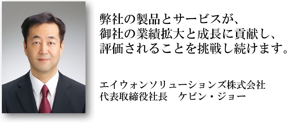 弊社の社名の由来についてご説明申し上げます。「AEWON(エイウォン)」は、約50年前に父が経営していた商社の社名であり、現在、弊社はB2B向けのIT関連ソリューションのコンサルティング、開発、製品・サービスの提供を行う企業として、その名を引き継いでおります。